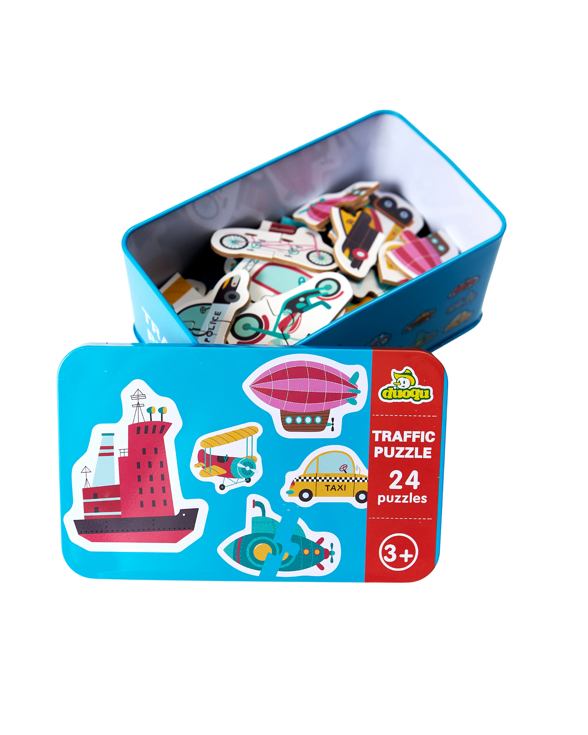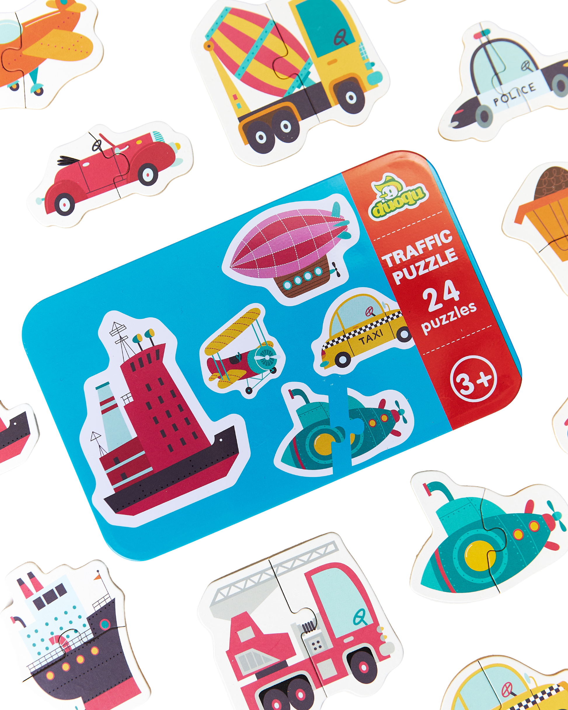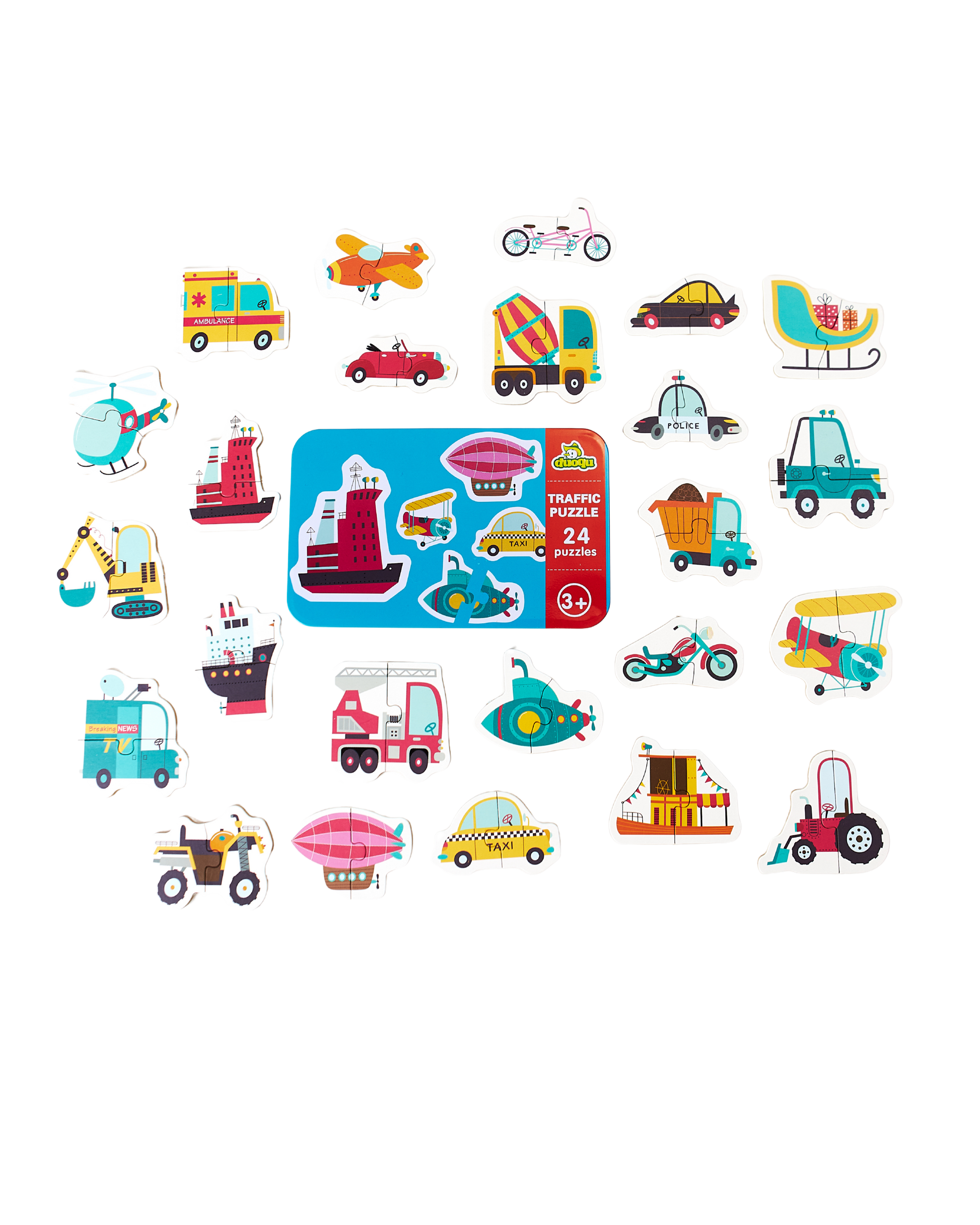 Zoom into action with 24 different vehicles – from taxis to helicopters! Each 2-piece wooden puzzle is labeled on the back, teaching toddlers vehicle names while building fine motor skills and imagination.